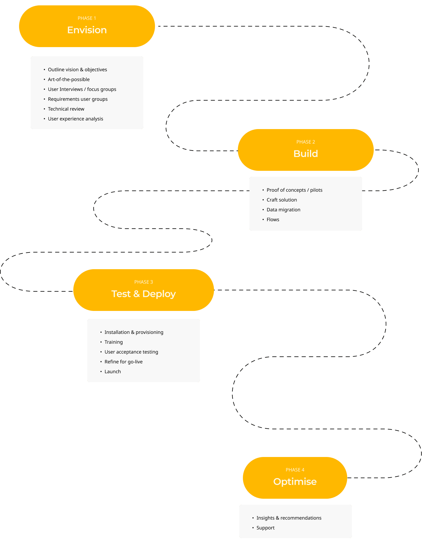 Our four phases Envision, Build, Test & Deploy and Optimise, combine our technical knowledge with our cross-industry experience to collaboratively build a solution with you. We’ll have checkpoints in each phase, with early and frequent demonstrations, to ensure you’re as excited for your solution as we are. We understand throughout the journey that things do change, so we’ll adapt and provide flexibility for your changing needs. Working with you, we’ll prioritise and re-prioritise what’s important to you to create a result with the greatest benefits.
